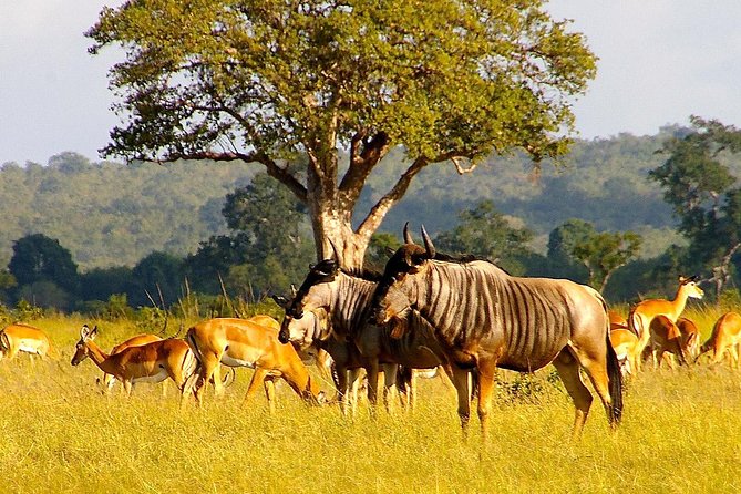 Animals commonly seen: elephants, giraffes, zebras, wildebeest, lions, and leopards.